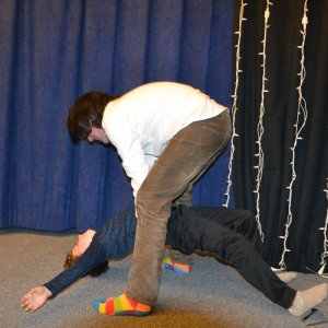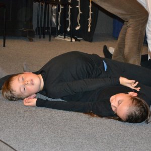 Po úvodním kolečku, při kterém zazněly novinky ze života, si děti i rodiče zařádili při oblíbené honičce "Zombíci". Nejrůznější pohybové hry probíhají na úvod téměř pokaždé, protože díky nim se soubor dobře odstřihne od všedního dne a prokysličí si mozek k další práci.